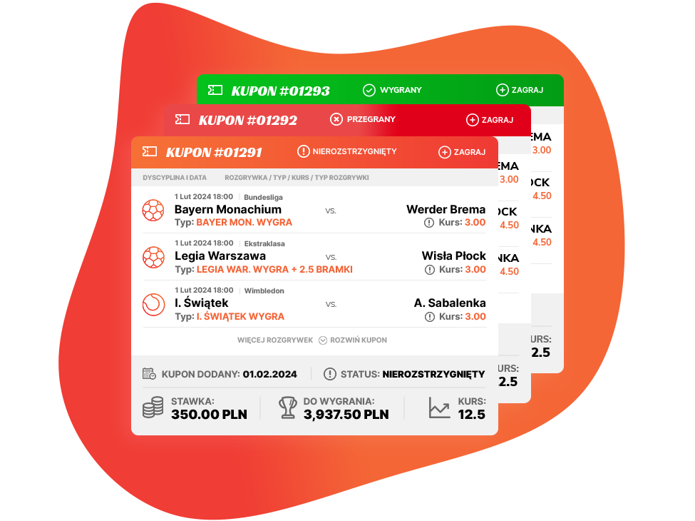 Poznaj nasze gotowe, codzienne kupony w nowej szacie graficznej. Tworząc nowy wygląd kuponów zależało na na tym aby były maksymalnie czytelne i intuicyjne. Każdy kupon posiada zestaw najważniejszych danych dotyczących rozgrywek oraz ich typów, kalkulacje rzeczywistych kursów a także podsumowanie z kursem łącznym, sugerowaną stawką oraz oczekiwaną wygraną. Kolorystyka kuponów zawiera także przydatne informacje - kolor zielony oznacza kupon wygrany, kolor czerwony - przegrany a pomarańczowy - kupon nieroztrzygnięty (niezakończona rozgrywka).