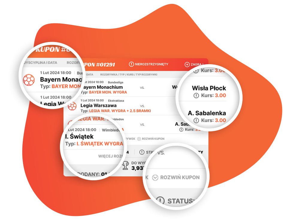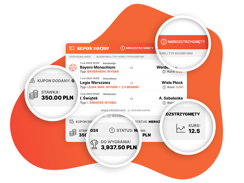 Prawdopodobnie najważniejsze dane na kuponie jakie Cię interesują to ile musisz postawić, jaki jest łaczny kurs i jaka będzie możliwa wygrana. Dlatego takie dane masz odseparowane od całej reszty - znajdziesz je w stopce kuponu. Dodatkowo w dwóch miejscach informujemy jaki jest status kuponu - jak tylko rozgrywki się zakończą, aktualizujemy status kuponu.