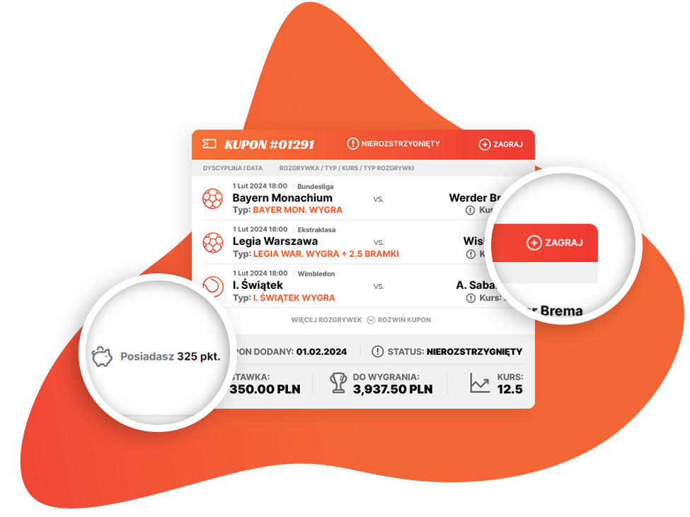 Codzienne kupony to propozycje typów oraz stawek przygotowanych przez naszych analityków. Oczywiście to ostatecznie Ty decydujesz za jaką chcesz stawkę zagrać dlatego wprowadziliśmy na nasze kupony element małej...grywalizacji. Możesz "zagrać" swoim kuponem według własnej stawki. Kupon zostaje zapisany w naszym systemie na Twoim koncie - dzięki temu możemy wyświetlać statystyki także Twoich kuponów. Dodatkowo za każdy zagrany kupon otrzymujesz punkty do Skarbonki które możesz wymienić na rabaty.