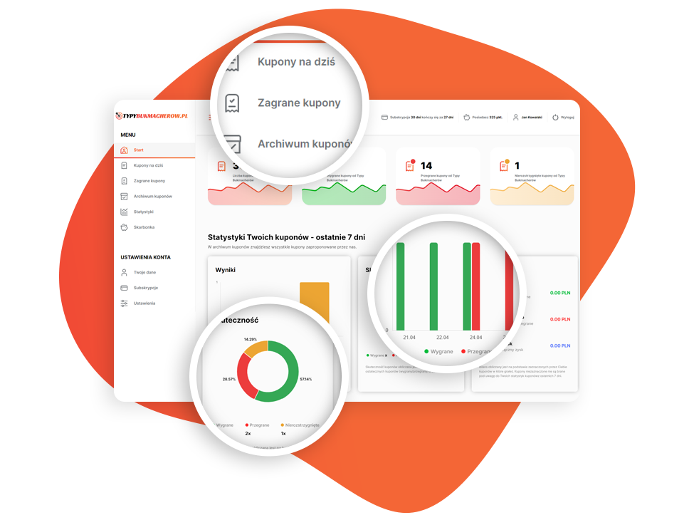 Przygotowaliśmy dla Ciebie panel w którym otrzymujesz dostęp do codziennych kuponów przygotowanych przez Typy Bukmacherów. W panelu znajdziesz także "Archiwum kuponów" które przygotowaliśmy w przeszłości a także swoje zapisane kupony z własną stawką. Dodatkowo masz dostęp do swoich oraz naszych statystyk a także ustawień własnego konta.